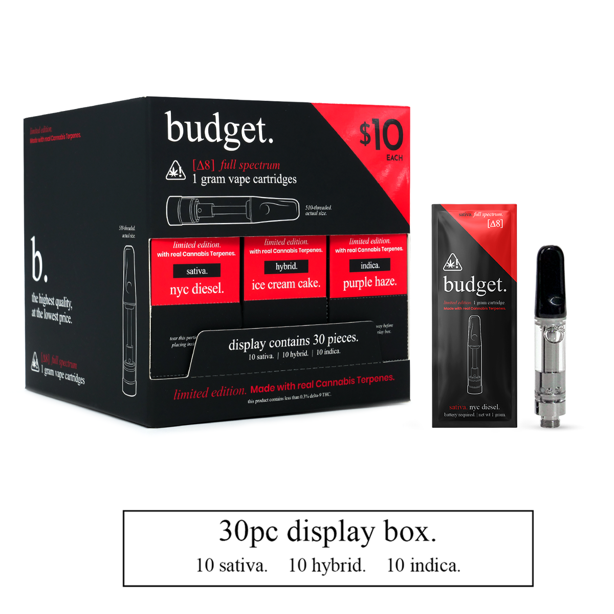 The Budget. 30-Piece Variety Pack of 1 Gram Delta-8 THC Full Spectrum Vape Cartridges is a reliable bulk option for retailers seeking a high-demand Delta-8 product at a competitive wholesale price. Each box includes 30 pre-filled vape cartridges, compatible with standard 510-thread batteries, and ready for retail shelves.