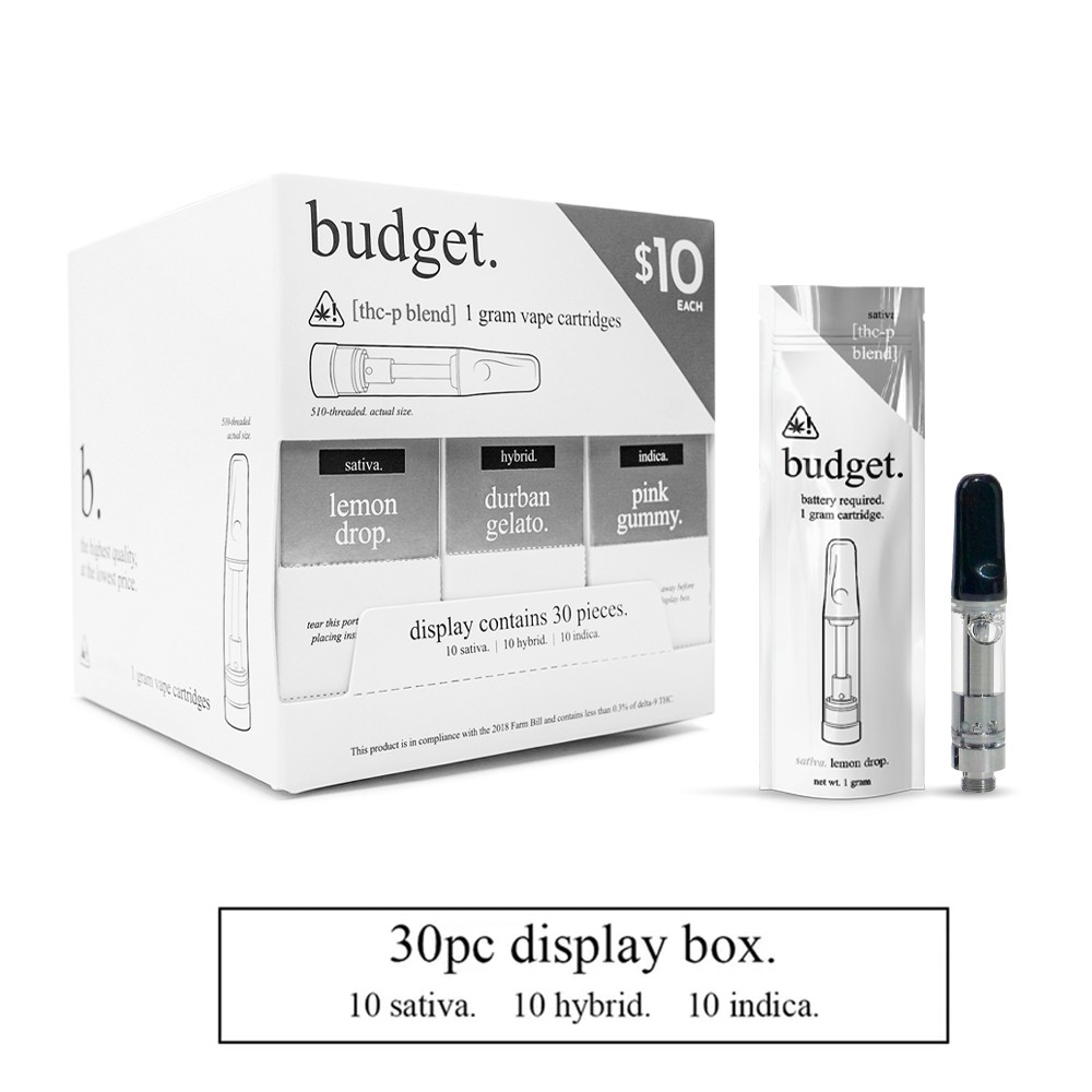 The Budget. 30-Piece Variety Pack of 1 Gram THC-P Blend Vape Cartridges is built for retailers seeking a reliable, budget-friendly bulk option for high-turnover vape inventory. Each wholesale box includes 30 pre-filled THC-P blend cartridges, ready for resale and compatible with standard 510-thread vape batteries.
