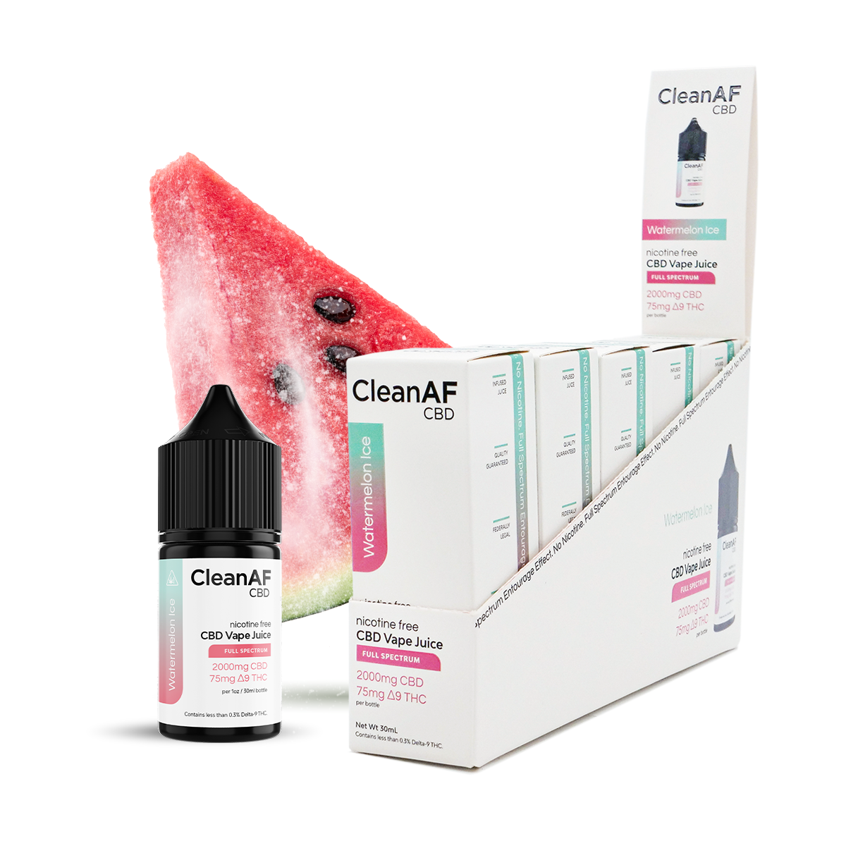 The CleanAF Watermelon Ice THC Vape Juice delivers a refreshingly sweet watermelon flavor paired with a cool, icy menthol finish. Crafted with a full spectrum CBD + Delta-9 THC formula, this vape juice is designed for use with refillable vaping hardware, offering flexibility and smooth, consistent performance.